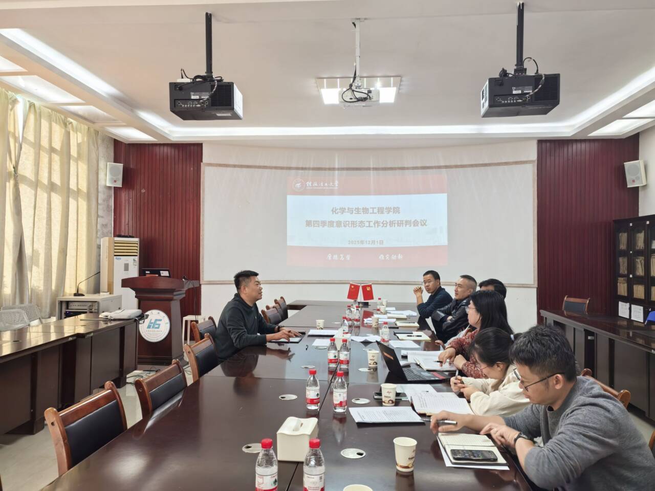 2025年12月1日下午,化學(xué)與生物工程學(xué)院在12217會議室召開了2025年第四季度意識形態(tài)工作分析研判會議。深入學(xué)習(xí)貫徹習(xí)近平總書記關(guān)于意識形態(tài)工作的重要論述,總結(jié)第三季度工作,分析當(dāng)前形勢,部署下一階段重點任務(wù)。學(xué)院黨政領(lǐng)導(dǎo)參加了此次會議,會議由學(xué)院黨委書記彭代江主持。