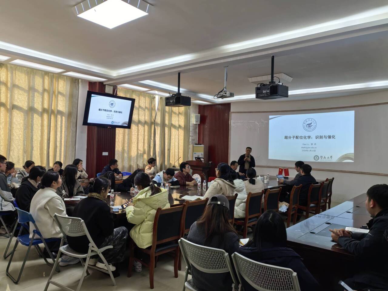 報告現(xiàn)場座無虛席。在交流環(huán)節(jié),李丹教授與在場師生圍繞超分子化學(xué)領(lǐng)域的前沿問題展開了深入討論。本次高水平學(xué)術(shù)報告有效促進了我校與兄弟院校的學(xué)術(shù)對話與合作,為相關(guān)學(xué)科的平臺建設(shè)與科研創(chuàng)新提供了有益支撐。 整場活動學(xué)術(shù)氛圍濃厚,有效拓寬了師生的科研視野,激發(fā)了創(chuàng)新思考。