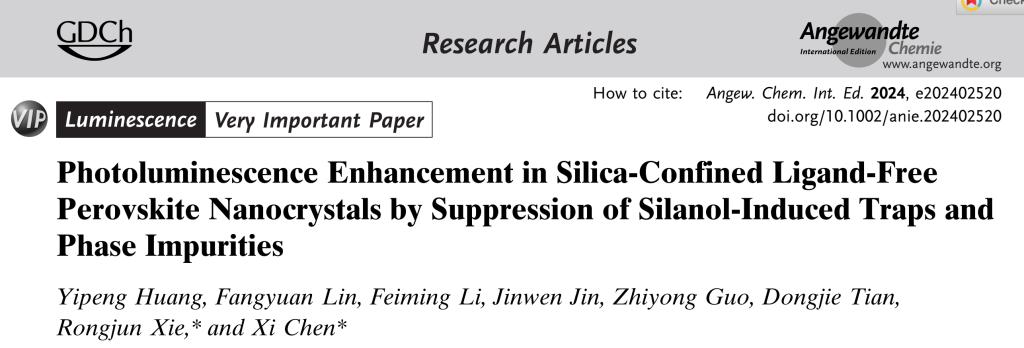 近日,我院黃藝鵬老師聯(lián)合廈門大學(xué)陳曦教授課題組和解榮軍教授課題組在化學(xué)頂級期刊Angewandte Chemie International Edition上發(fā)表題為“Photoluminescence Enhancement in Silica-Confined Ligand-Free Perovskite Nanocrystals by Suppression of Silanol-Induced Traps and Phase Impurities”(DOI: 10.1002/anie.202402520)的研究論文。論文的第一作者為黃藝鵬博士,通訊作者為廈門大學(xué)的陳曦教授和解榮軍教授。該研究得到國家自然科學(xué)基金促進海峽兩岸科技合作聯(lián)合基金(No. U2005212)的支持。