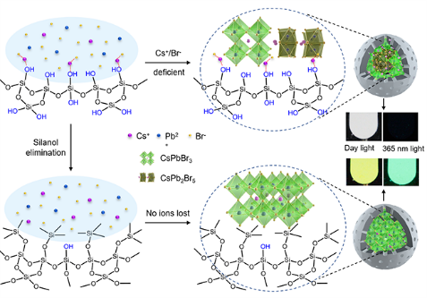 鑒于此,研究團隊深入研究了介孔硅界面本征的硅羥基活性基團對CsPbBr3納米晶的限域生長及其光學(xué)性能的影響,首次揭示了在CsPbBr3 納米晶在限域生長過程中硅羥基的存在會造成Cs+和Br-空位缺陷,造成CsPb2Br5雜質(zhì)相的生成。并且硅羥基的含量越高,CsPbBr3納米晶形成的缺陷越多,熒光效率越低。通過去硅羥基化能夠有效抑制深層缺陷和雜質(zhì)相的形成,顯著提升介孔硅限域的鈣鈦礦納米晶的發(fā)光效率(最高可提升160倍)。研究成果為制備高質(zhì)量的無配體型鈣鈦礦納米晶提供新的視角和參考依據(jù)。
