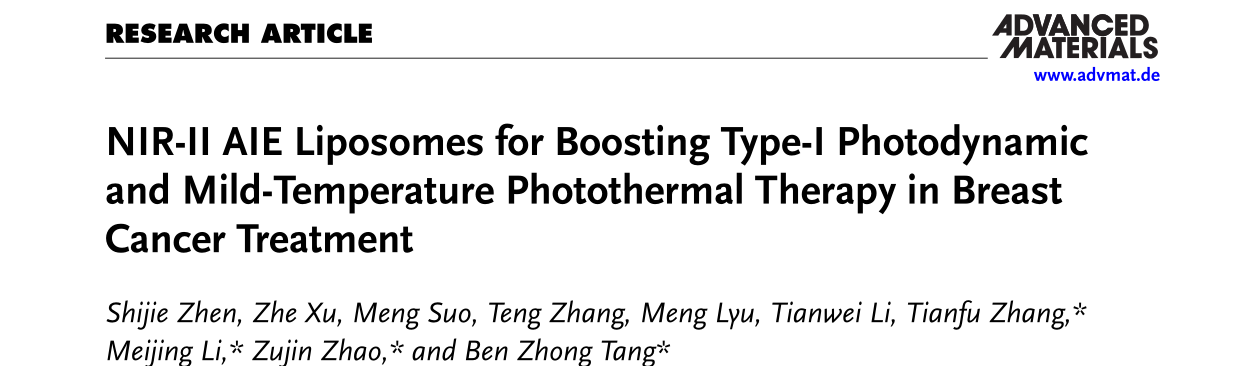 近日,我院甄士杰老師/李美靜博士聯(lián)合廣州醫(yī)科大學(xué)張?zhí)旄桓苯淌凇?/span>華南理工大學(xué)趙祖金教授和香港中文大學(xué)(深圳)唐本忠院士在頂級(jí)期刊Advanced Materials上發(fā)表題為《NIR-II AIE Liposomes for Boosting Type-I Photodynamic and Mild-Temperature Photothermal Therapy in Breast Cancer Treatment》(10.1002/adma.202411133)的研究論文。論文第一作者是我院甄士杰博士、徐哲碩士及廣州醫(yī)科大學(xué)索萌博士,桂林理工大學(xué)為第一單位,桂林理工大學(xué)李美靜博士、廣州醫(yī)科大學(xué)張?zhí)旄桓苯淌凇⑷A南理工大學(xué)趙祖金教授和香港中文大學(xué)(深圳)唐本忠院士為論文共同通訊作者。該工作得到國(guó)家自然科學(xué)基金和廣西科技計(jì)劃等項(xiàng)目資助。