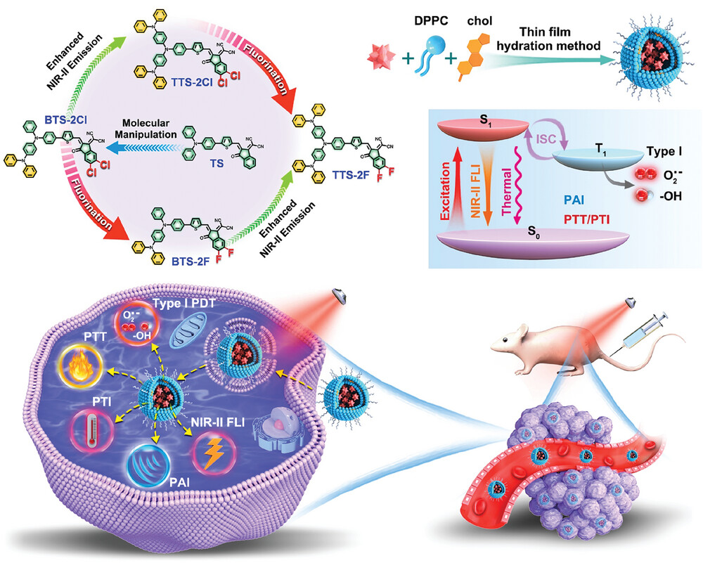 光診療作為一門新興的生物技術(shù),由于在癌癥精準(zhǔn)診斷和高效治療方面的巨大潛力,引起了廣泛關(guān)注。然而,由于難以平衡的復(fù)雜光能耗散途徑,構(gòu)建一個(gè)既具有三模態(tài)成像(包括熒光成像(FLI)、光聲成像(PAI)和光熱成像(PTI))又具有雙模態(tài)治療(光動(dòng)力治療(PDT)和光熱治療(PTT)能力的單一分子仍然是一項(xiàng)重大挑戰(zhàn)。